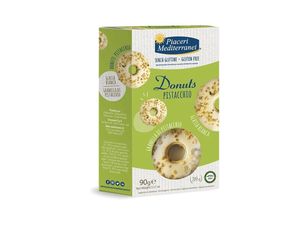 Donuts Pistacchio od Piaceri Mediterranei jsou měkké a vláčné bezlepkové donuty s bílou polevou a posypané kousky pistácií. Díky praktickému balení po dvou kusech jsou ideální jako rychlá svačina doma, v práci nebo na cestách.