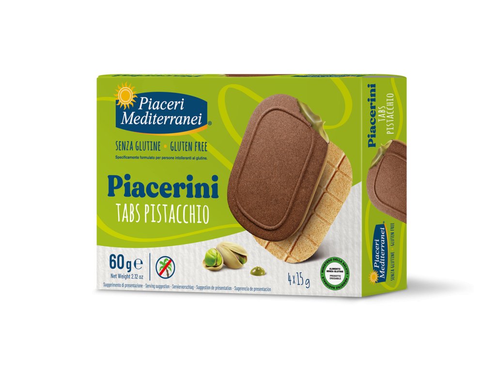 Piacerini Tabs Pistacchio jsou bezlepkové vaflové sušenky s jemnou pistáciovou náplní, bez palmového oleje a vajec. Skvělé ke kávě nebo jako sladký snack.