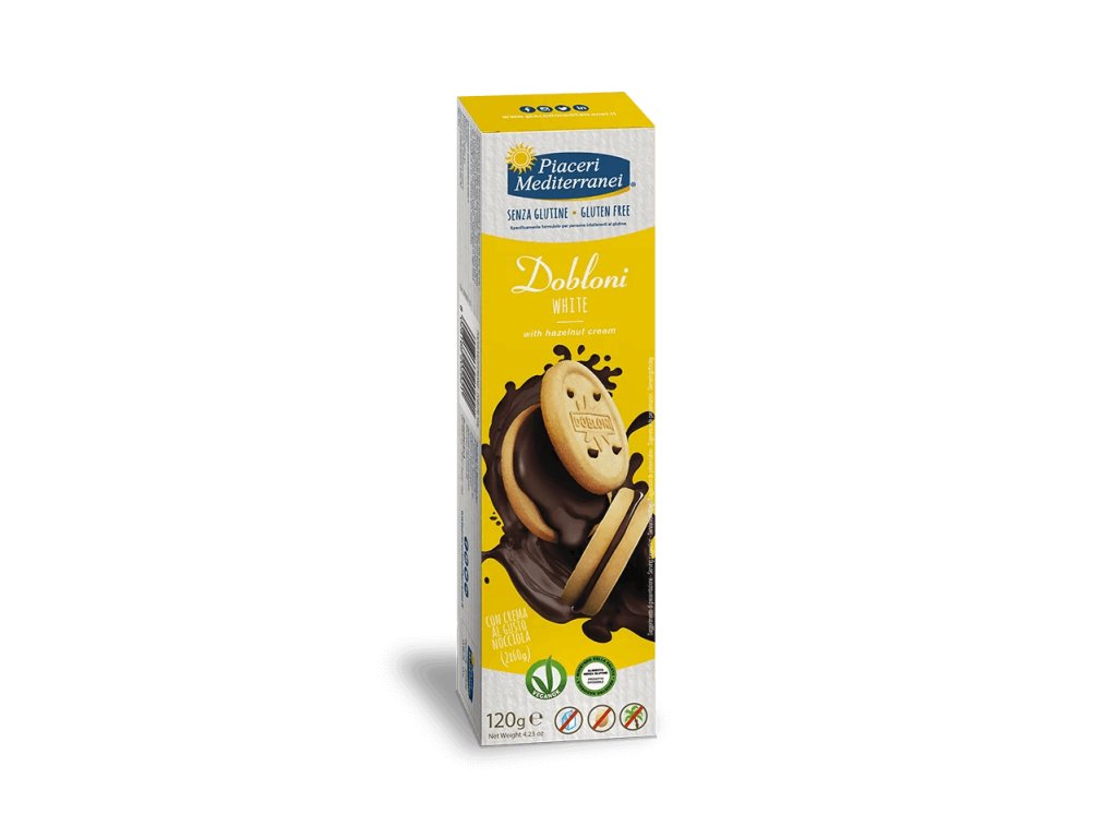 Dobloni White jsou bezlepkové sušenky plněné lahodným krémem s oříškovou příchutí. Bez mléka, vajec a palmového oleje, ideální i pro vegany.