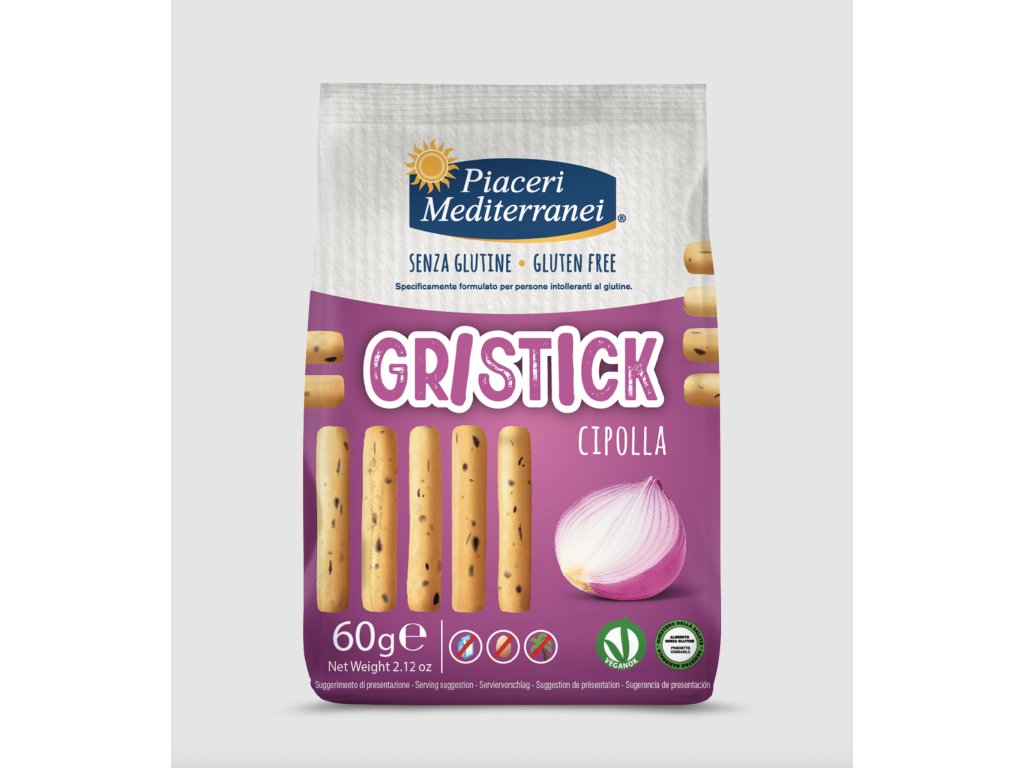 Gristick Cipolla jsou bezlepkové křupavé mini grissini s příchutí cibule. Neobsahují laktózu, mléko, palmový olej ani vejce, což je činí vhodnými i pro vegany.